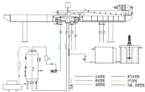 工作原理及構(gòu)造:利用溶氣系統(tǒng)向水中溶入大量的空氣,形成溶氣水,進(jìn)入待處理水中,減壓釋放后在水中形成大量的微細(xì)氣泡,氣泡與水中 的雜質(zhì)、絮粒相互粘附,形成比重小于水的浮體,從而快速浮出水面,經(jīng)刮渣裝置撇除后,完成固、液兩相分離,使水質(zhì)得到 凈化。主要由池底、撇渣裝置、工作橋與行走裝置、布水布?xì)庋b置、集水裝置、集電裝置組成。