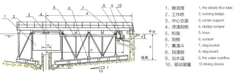 1、當(dāng)池徑大于30M 時(shí),刮臂一般采用雙臂,且橡膠輪改為鐵心鋼車輪或雙輪圓珠鋼輪。